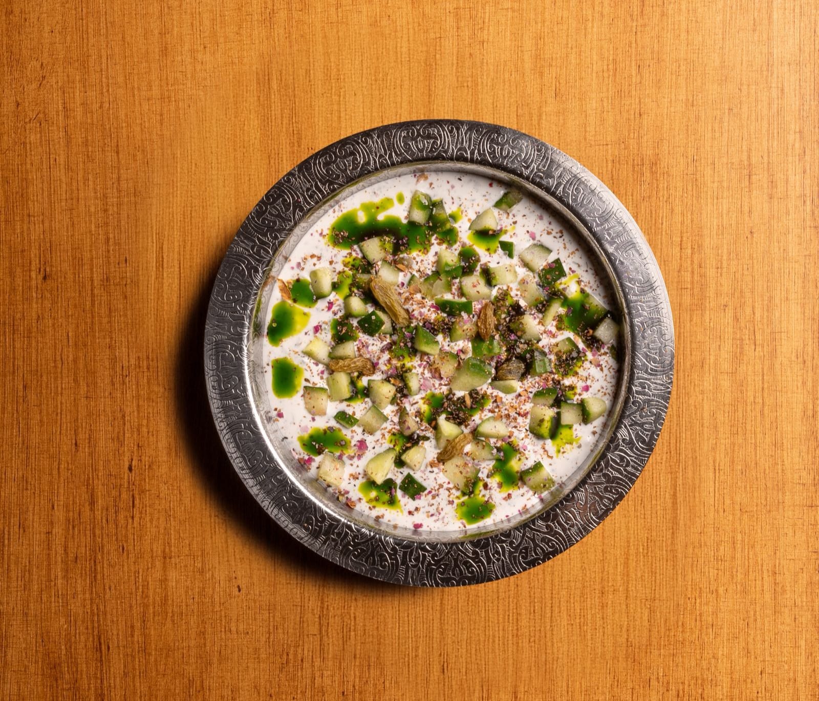زبادي مصفى ، خيار ، نعناع وزبيب أخضر